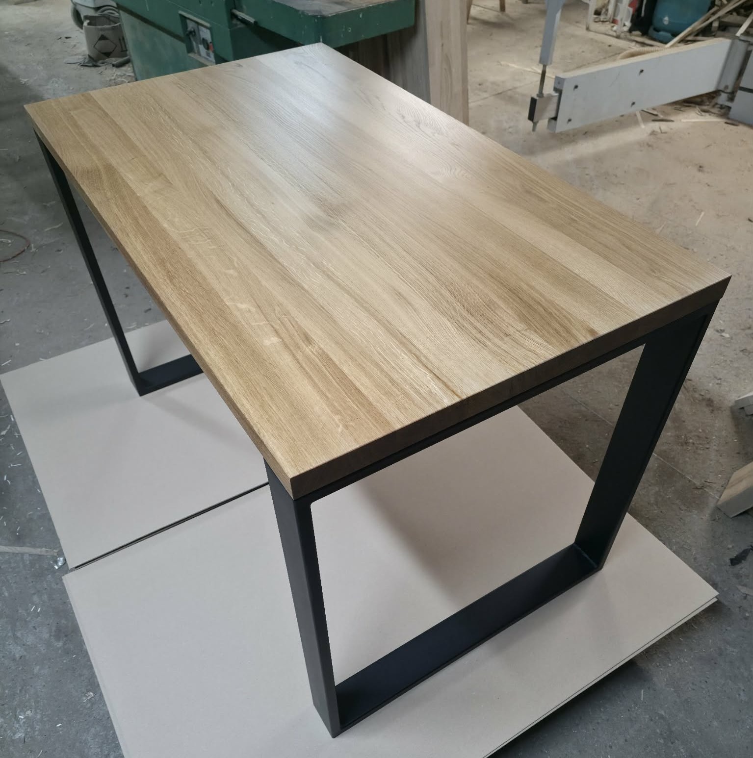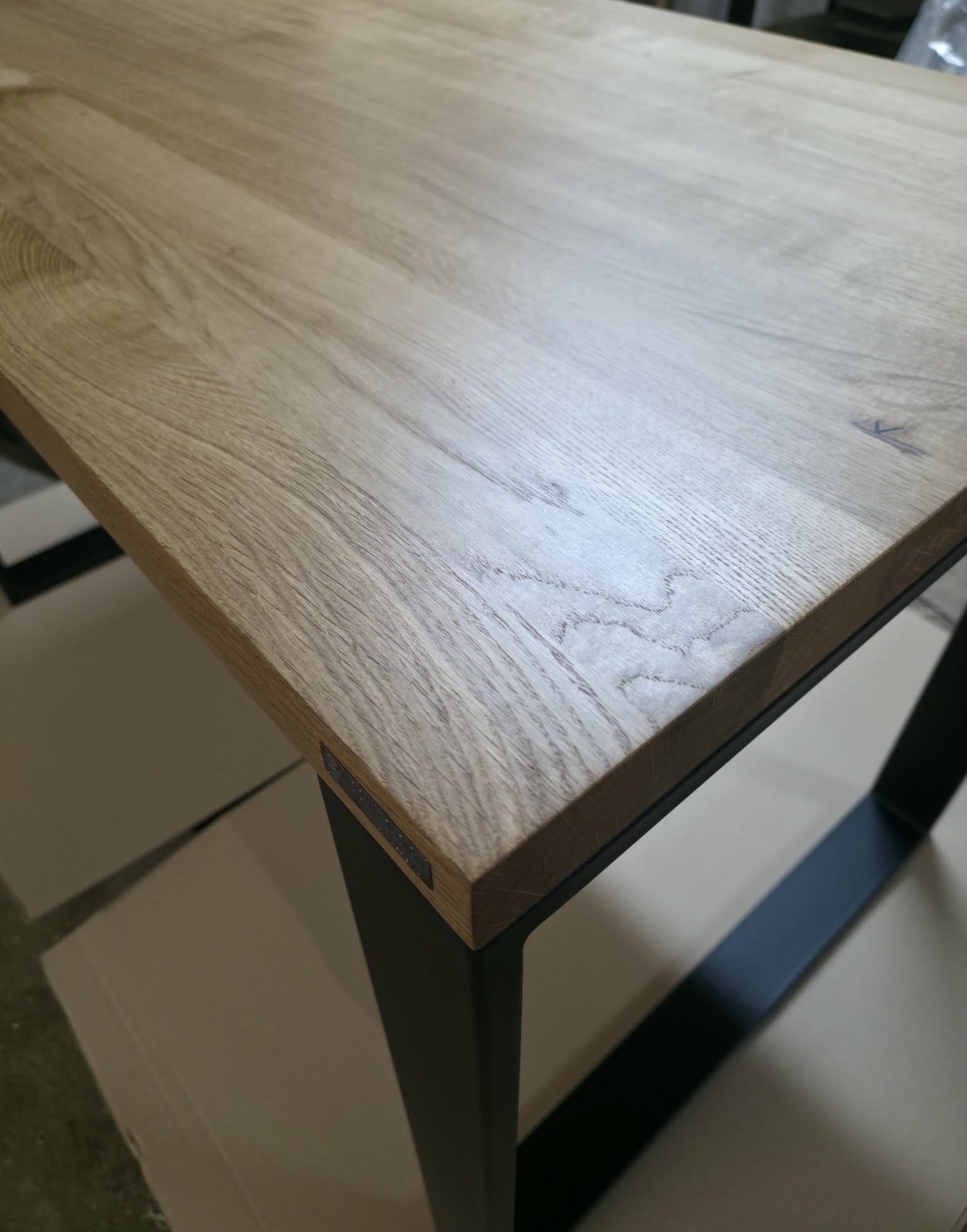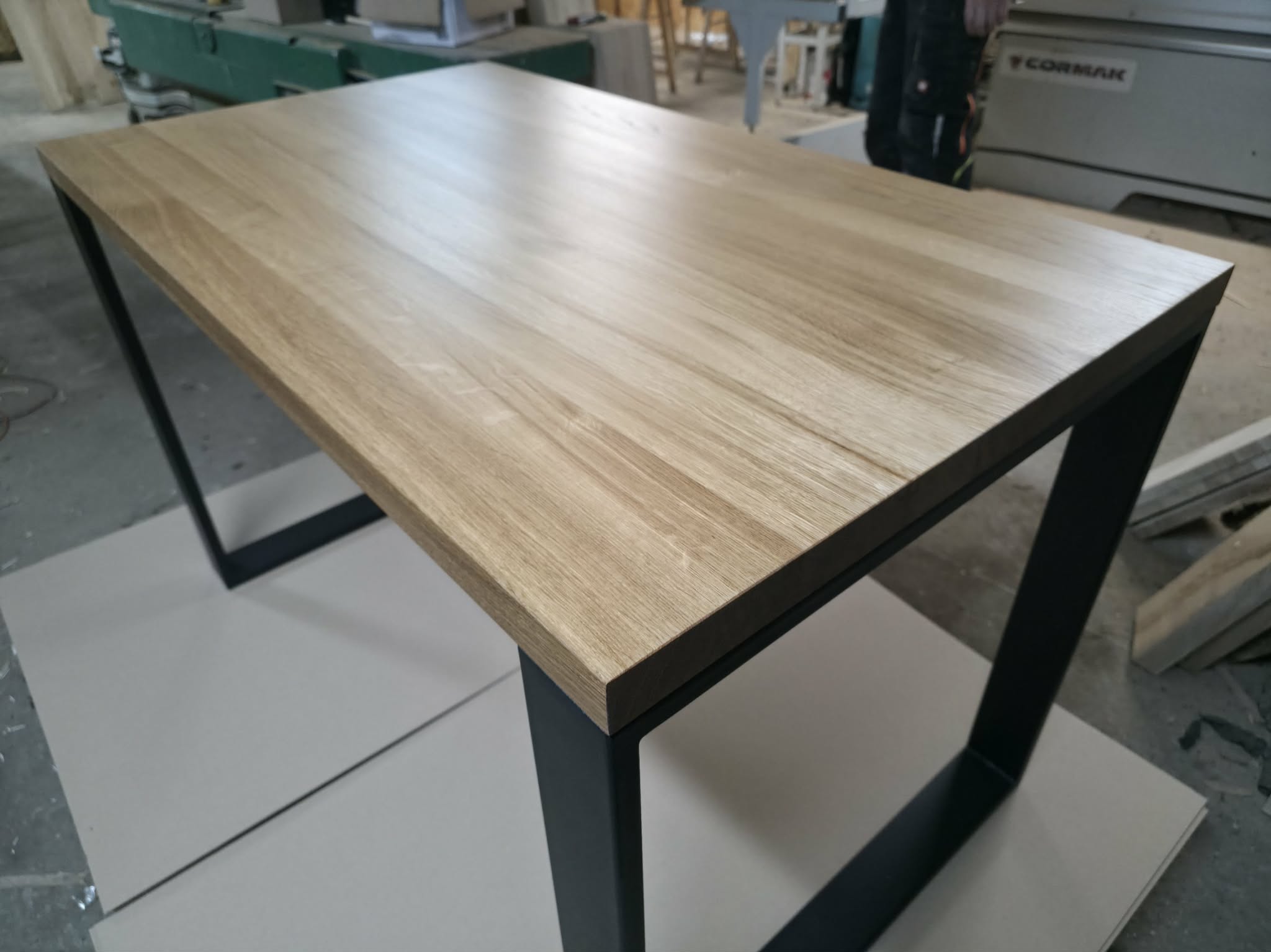 Biurko loftowe CLASSIC z litym drewnianym blatem dębowym i prostokątnymi metalowymi nogami