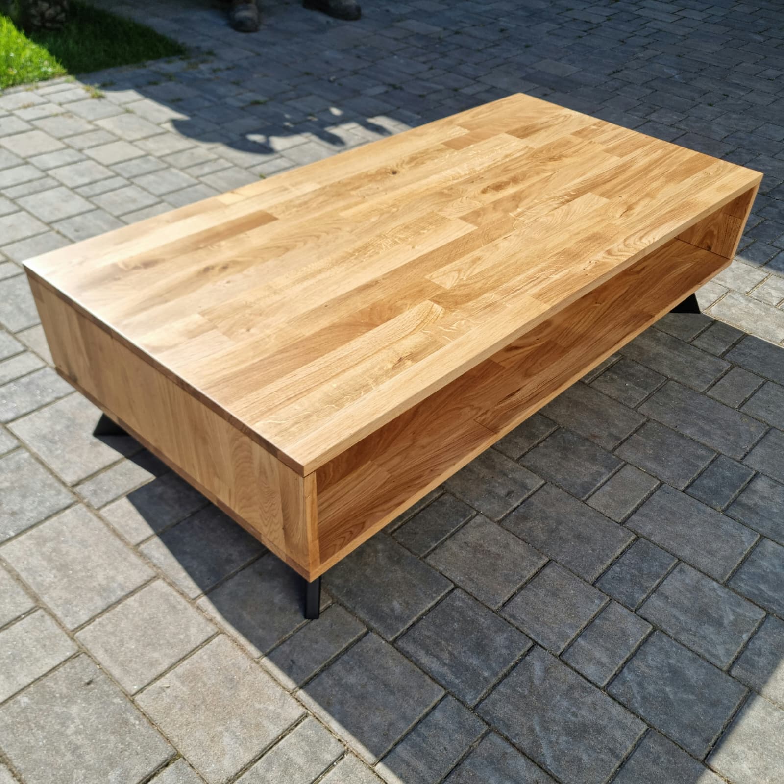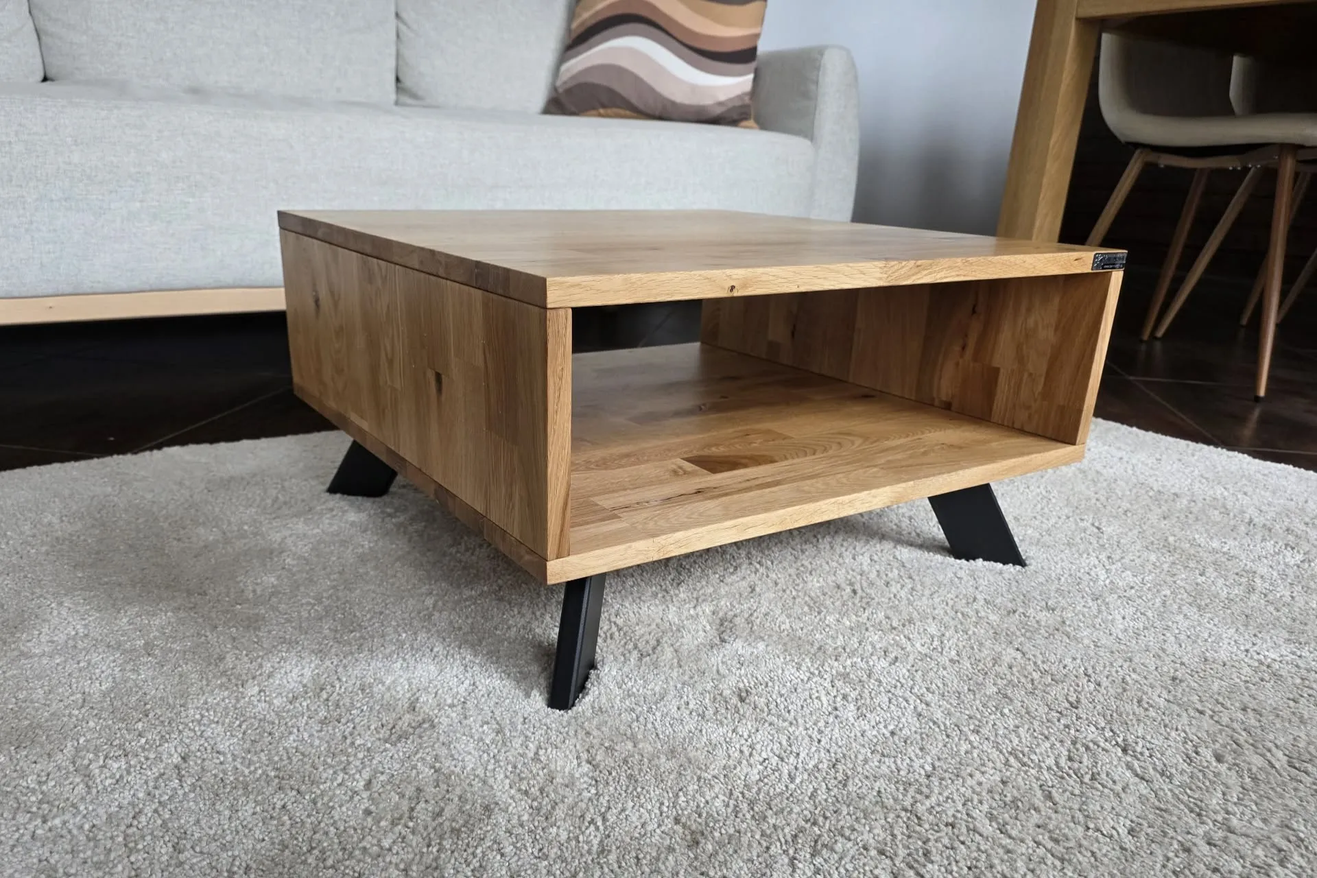Całość opiera się na czterech metalowych nóżkach ustawionych pod kątem 30 stopni, co dodaje meblowi dynamiczności i lekkości, jednocześnie zapewniając stabilność. Delikatne, acz wyraziste połączenie drewna i metalu tworzy doskonały kontrast, który wpasowuje się zarówno w industrialne, jak i bardziej klasyczne wnętrza. Dzięki starannie dopracowanym detalom, stolik ten staje się centralnym punktem każdego salonu, zachwycając swoją prostotą i elegancją.