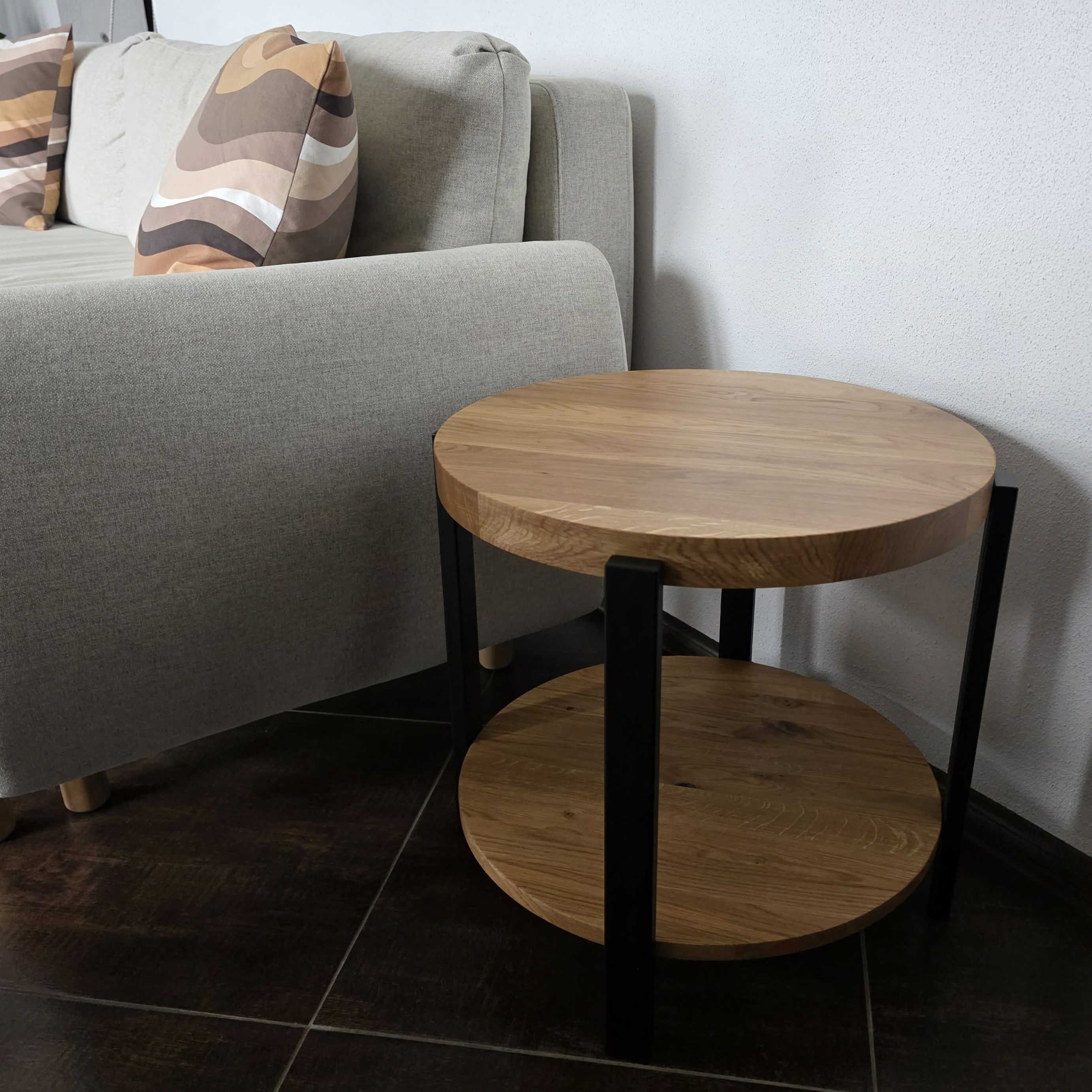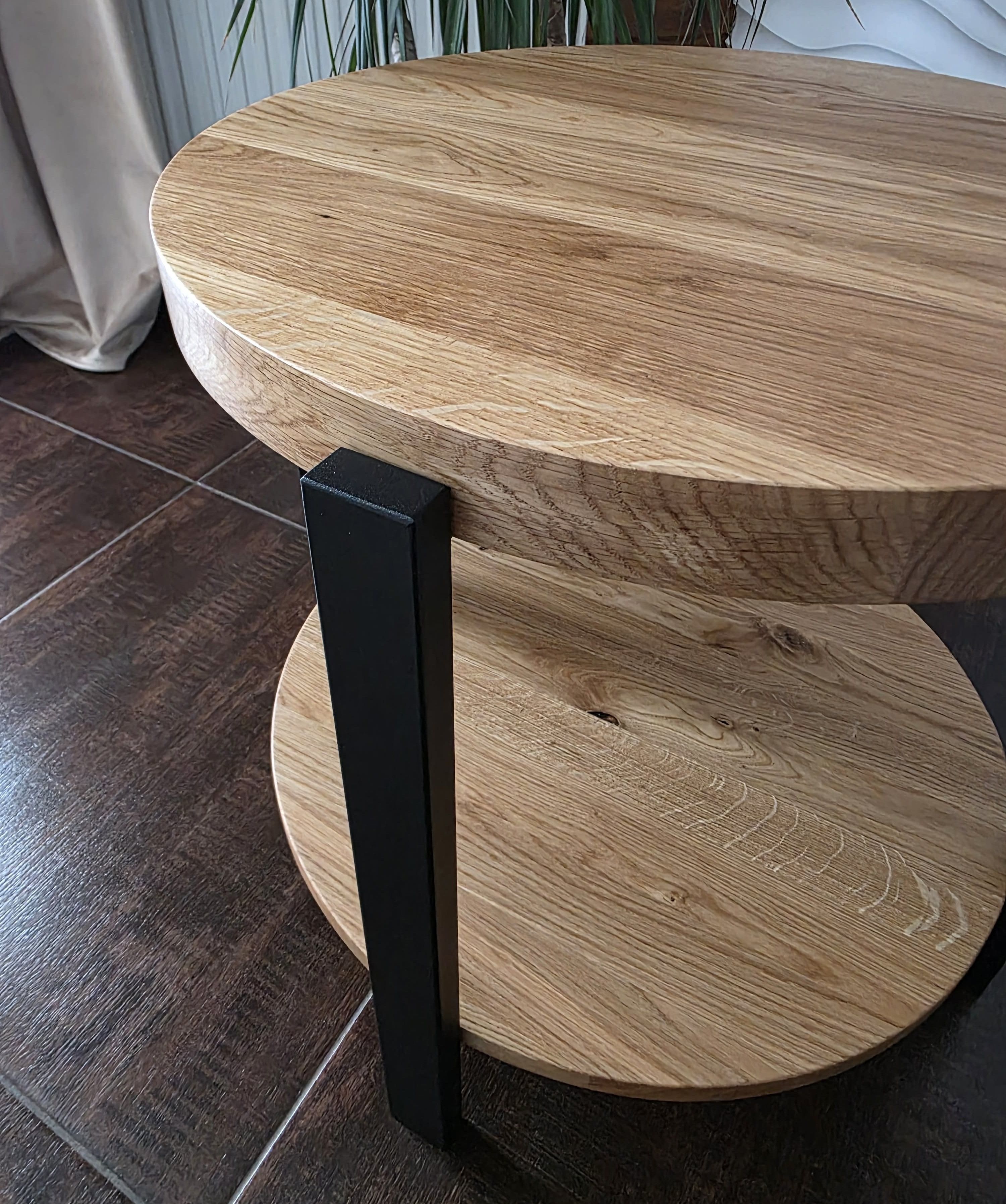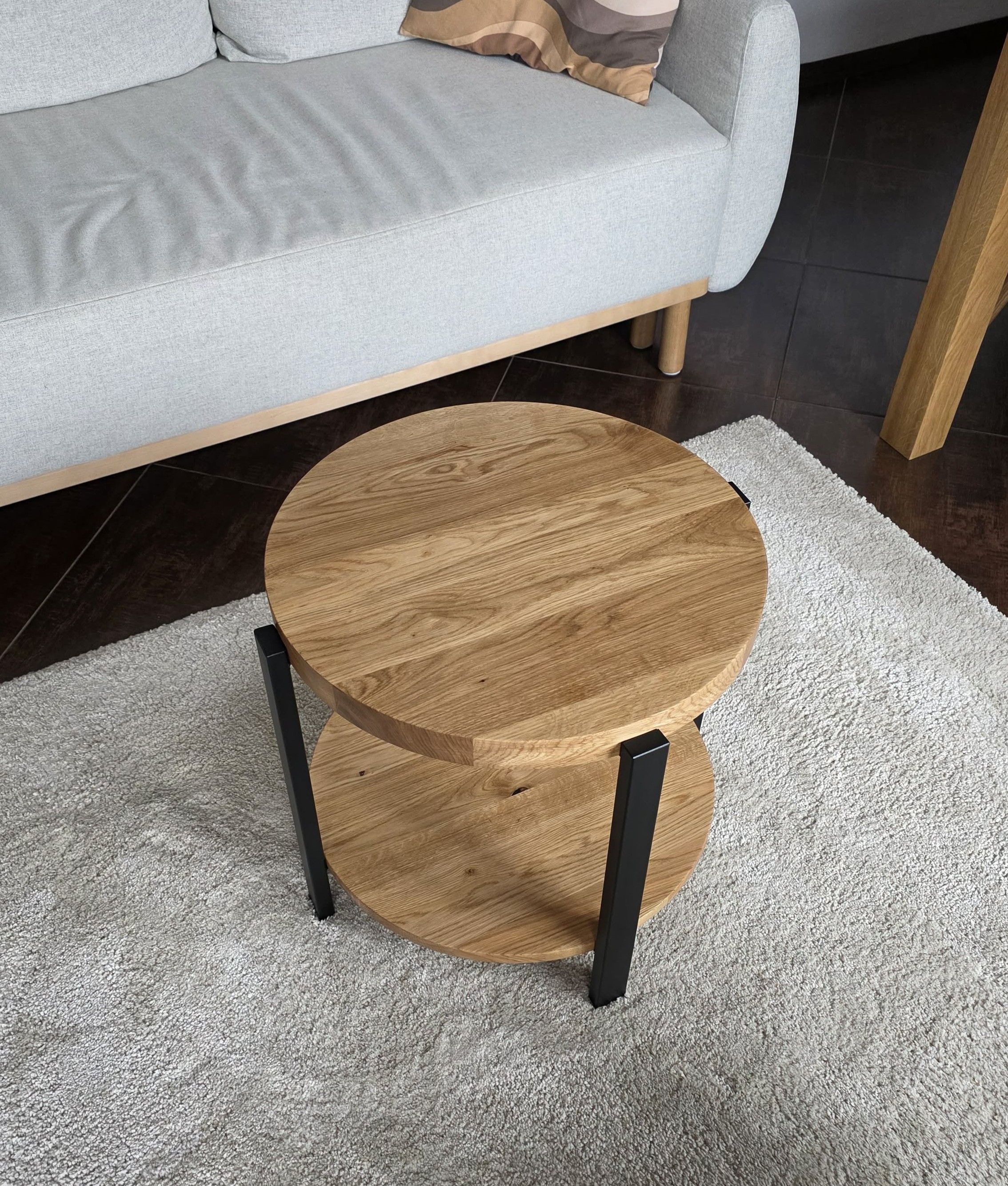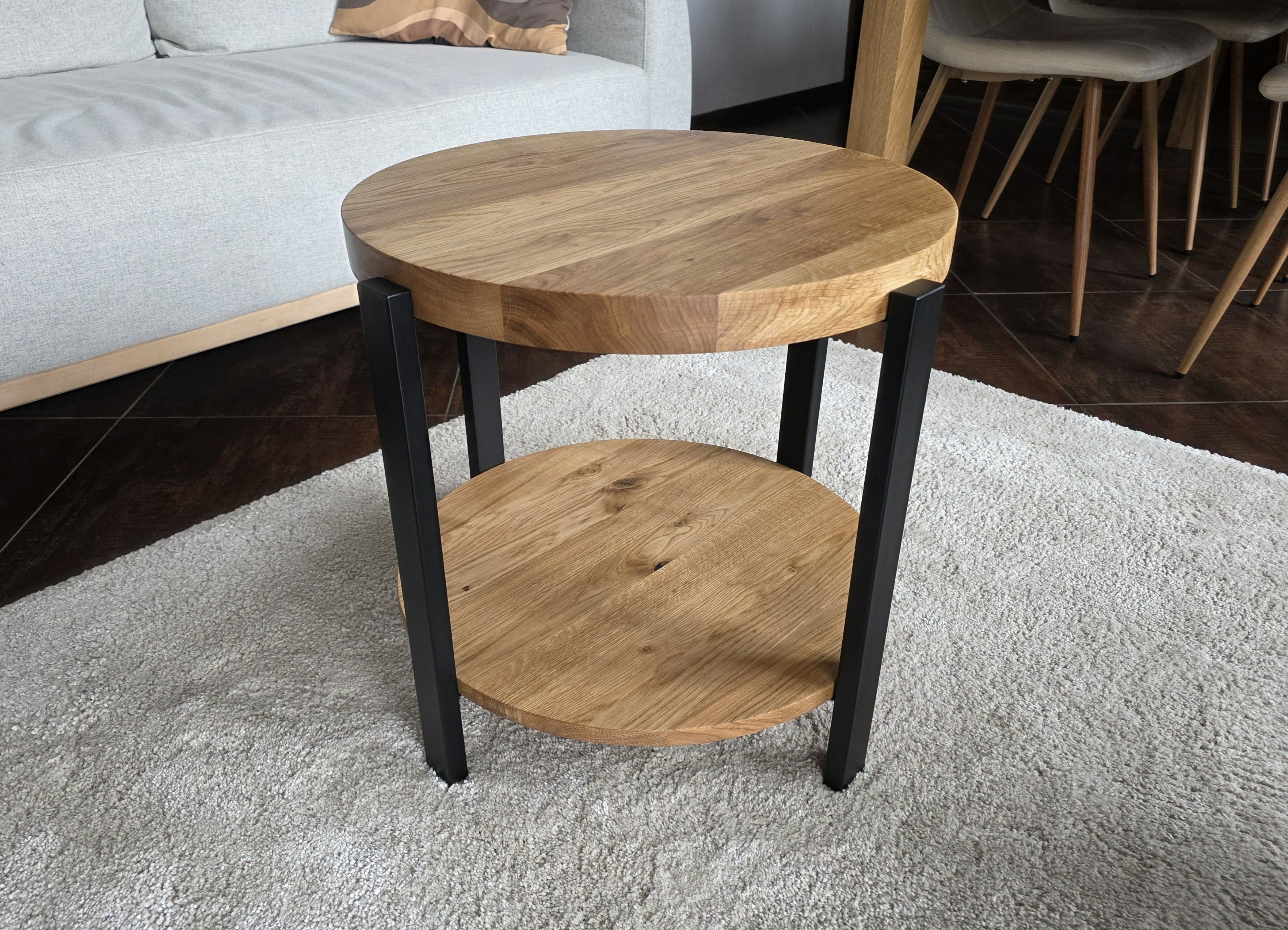 Stolik kawowy AURA to połączenie nowoczesnej formy, funkcjonalności i ponadczasowego designu. Okrągły blat dębowy o grubości 40 mm nadaje meblowi solidny i elegancki charakter, a umieszczona pod nim okrągła półka o grubości 18 mm zwiększa jego praktyczność, oferując dodatkowe miejsce na książki, dekoracje lub codzienne akcesoria.